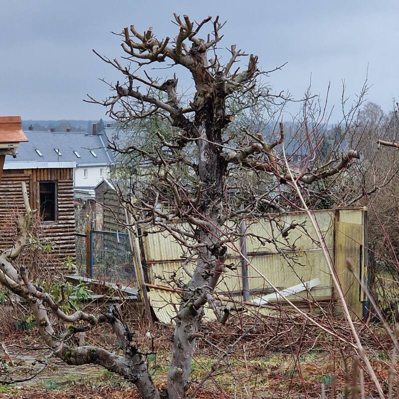 Gerade in der heutigen Zeit unter den Bedingungen des Klimawandels ist es unbedingt notwendig, Gärtnern neu zu denken. Alte große Obstbäume bieten Lebensraum für viele Tiere, tragen zur Artenvielfalt bei und haben einen hohen ökologischen Wert. Alte Bäume verbessern das Kleinklima, filtern Staub und Schadstoffe aus der Luft, spenden Schatten und können zur Bodenverbesserung beitragen. Man kann auch dort eine Schaukel ranhängen und gemütlich und kühl im Schatten sitzen. Da brauche ich dann auch keinen einbetonierten großen Sonnenschirm oder ein Sonnensegel. Mit der richtigen Pflege und gegebenenfalls fachgerechten Schnittmaßnahmen können alte Obstbäume zu einer Bereicherung für den Garten und die Natur werden. Ein radikaler Schnitt mit der Kettensäge ist der garantierte Tod für so einen wertvollen Baum. Hier mal ein paar ganz schlechte Beispiele ...